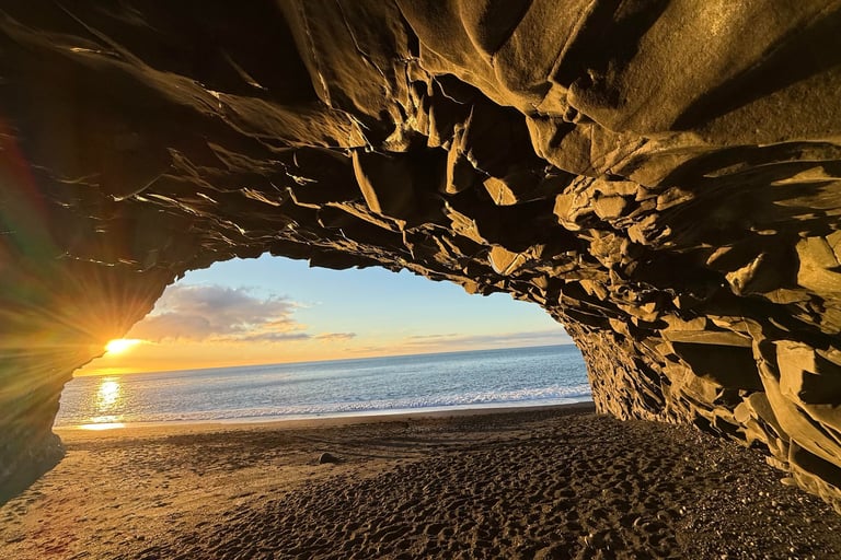 We began our day at Reynisfjara, the famous black sand beach near Vík. Even though we’d seen pictures before, we were still in awe of the beauty of the jet-black volcanic sand and the basalt columns. The kids tried to scale the towering basalt columns and collected tiny smooth stones as souvenirs. We also stepped into Hálsanefshellir Cave and enjoyed watching the sun as it crept into view (see photo above).